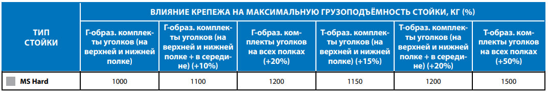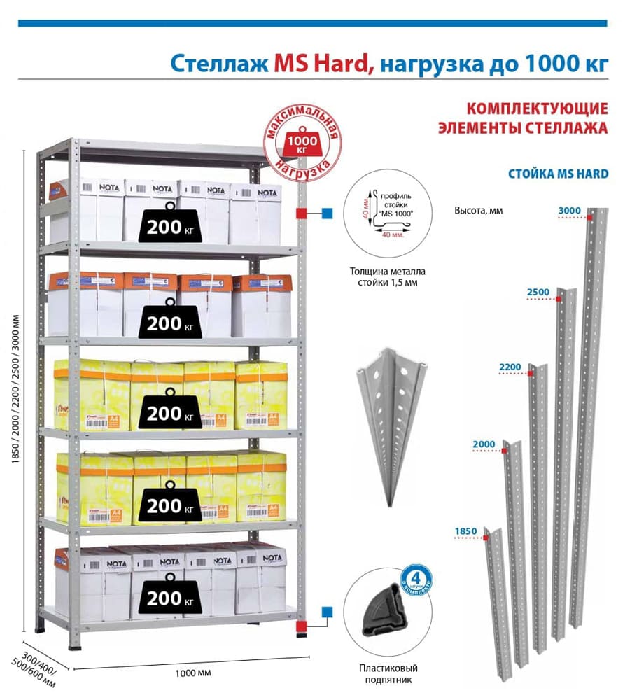 Стеллаж MS Hard 300/100x60Артикул: 35531-1Артикул: 35531-2Артикул: 35531-3Артикул: 35531-4Варианты: 5 полок6 полок7 полок8 полокОсновной склад: Нет в наличииСклад Новосибирск: Нет в наличииОсновной склад: Нет в наличииСклад Новосибирск: Нет в наличииОсновной склад: Нет в наличииСклад Новосибирск: Нет в наличииОсновной склад: Нет в наличииСклад Новосибирск: Нет в наличии 16 890 Р 11 180 РЭкономия: 5 710 Р Стеллаж MS Hard 300/100x60 теперь в вашей корзине покупок ОписаниеХарактеристикиОтзывыДокументацияДоставкаОплатаОписание Стеллаж MS Hard 300/100x60 Металлические стеллажи для склада и мастерских Металлические стеллажи MS Hard могут использоваться в различных сферах деятельности как в офисном или производственном пространстве, так и на складах или мастерских. Применение стеллажей не ограничивается нашими рекомендациями и зависит от поставленных целей и нужд заказчика. Нажмите, чтобы увеличить картинку Особенности стеллажей серии MS Hard: Стойки MS Hard: усиленный угловой профиль сложного сечения 40х40 мм; толщина стали 1,5 мм; два вида усилителя стоек: Г-образный (сборка с использованием болтов и гаек), и Т-образный (сборка без гаек). Полки MS Hard: равномерно распределенная нагрузка на полку – 200 кг; высота бокового ребра полки – 33 мм; шаг регулирования высоты полок – 25 мм; толщина основания 0,7 мм. Стеллаж MS Hard: максимальная нагрузка – 1000 кг; два вида подпятников: пластиковые или регулируемые металлические (при установке регулируемых подпятников нагрузка снижается до 400 кг и увеличение грузоподъемности за счет использования усилителей невозможно); цвет: серый полуматовый (RAL 7038). Стандартная комплектация: Стойка MS Hard 300 – 4 шт. Полка MS Hard 100x60 – выбранное количество Крепеж стойки MS Hard (уголки 4 шт) – 6 шт. Дополнительные аксессуары для стеллажа: Нажмите на картинку, чтобы посмотреть все дополнительные аксессуары для стеллажаХарактеристики Внешние размеры (ВхШхГ)3000 × 1000 × 600 мм Нагрузка на стеллаж, кг1000 Макс. нагрузка на полку, кг200 Кол-во полок5, 6, 7, 8 Толщина металла стойки, мм1 Толщина металла полки, мм0.7 Шаг перфорации стойки, мм25 Креплениена болтах Покрытиепорошковое Вес стоек (4 шт.) без полок, кг16 Вес одной полки, кг6 Гарантия1 год ПроизводительПРОМЕТ (Россия) Отзывы посетителей(0)Оставьте отзыв об этом товаре первым!ДокументацияДоставкаТранспортировка товара с Основного склада до адреса в Барнауле или ПВЗ (пункта выдачи заказов) осуществляется в течение 2-9 рабочих дней после оформления заказа и его оплаты. Варианты доставки: Доставка до адреса Самовывоз из ПВЗ (пункта выдачи заказов) Стоимость транспортировки зависит от заказа (объем, вес) — её можно уточнить у менеджера по тел.: Порядок получения заказаПри получении заказа рекомендуется распаковать товар и сверить с заказом. После получения и проверки заказа необходимо ознакомиться с документами и подписать их.После подписания акта приёма-передачи претензии по комплектации не принимаются. Доставка по всей РоссииМы можем отправить товар в любой город России транспортными компаниями. Склады расположены в 34 городах страны. Наши менеджеры могут подобрать самый оптимальный вариант доставки до Вашего города. Мы работаем с любыми транспортными компаниями, с которыми Вам удобнее работать. Наши менеджеры самостоятельно рассчитывают стоимость во многих крупных транспортных компаниях и предлагают клиентам более быстрый и недорогой спос