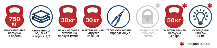 Верстак Profi WT100.WD1/WD2.000Артикул: 15818-1Артикул: 15818-2Артикул: 15818-3Артикул: 15818-4Артикул: 15818-5Выберите Экран верстака: двойной экранодинарный экранбез экранаВыберите Освещение верстака: без освещениясветодиодное освещениеОсновной склад: Нет в наличииСклад Новосибирск: Нет в наличииОсновной склад: Нет в наличииСклад Новосибирск: Нет в наличииОсновной склад: Нет в наличииСклад Новосибирск: Нет в наличииОсновной склад: Нет в наличииСклад Новосибирск: Нет в наличииОсновной склад: Нет в наличииСклад Новосибирск: Нет в наличииТовар с выбранным набором характеристик недоступен для покупки 36 880 Р 27 892,80 РЭкономия: 8 987,20 Р Верстак Profi WT100.WD1/WD2.000 теперь в вашей корзине покупок ОписаниеХарактеристикиОтзывыДокументацияДоставкаОплатаОписаниеВерстак Profi WT100.WD1/WD2.000 Верстаки серии Profi W предназначены для удобной организации рабочего места на производстве, в учебных заведениях, мастерских и гаражах. Нажмите, чтобы увеличить картинку Столешница верстака изготовлена из МДФ толщиной 24 мм, покрытой оцинкованным листом металла толщиной 1,2 мм. Тумба WD-1 укомплектована 2-мя съемными регулируемыми полками (с шагом 80 мм) и 1 дверцей, возможность смены стороны открывания двери. Нагрузка на полку в тумбе 30 кг. Установлен ключевой замок на дверце тумбы. Тумба WD-2 комплектуется съемной регулируемой полкой (с шагом 80 мм). Нагрузка на полку в тумбе 30 кг. Есть возможность смены стороны открывания дверцы. Установлен ключевой замок Практик. Выдвижной ящик оборудован телескопическими направляющими и ключевым замком Практик. Нагрузка на ящик в тумбе 30 кг. Полезные габариты ящика (ВхШхГ): 100х380х600 мм. Верстак окрашен порошковой краской, способной выдерживать длительную температурную и механическую нагрузку. Опция для верстака: экран с толщиной металла 1,2 мм, квадратной перфорацией 10х10 мм, шагом 38 мм. Нагрузка на экран 50 кг. Опция для экрана: светодиодное освещение с мощностью 11 Вт, световым потоком 880 лм, цветовой температурой 4000 К. Верстак поставляется в разобранном виде. Нажмите, чтобы увеличить картинку Базовая комплектация: Столешница WT-100 – 1 шт. Тумба WD-1 - 1 шт. Тумба WD-2 - 1 шт. Дополнительные опции: Комплект косынок для крепления экранов WS – 1 шт. Комплект освещения W – 1 шт. Кронштейн крепления двух экранов WS (2 шт.) – 1 шт. (если нет освещения) Экран WS-100 (без косынок) – 1 шт. (количество зависит от выбранной модели) Дополнительные аксессуары на экран для инструментов: Помогают удобно организовать рабочее место Нажмите на картинку, чтобы посмотреть все дополнительные аксессуары на экранХарактеристики Макс. нагрузка на верстак, кг750 Макс. нагрузка на полку, кг30 Макс. нагрузка на ящик30 кг Высота рабочей поверхности, мм870 Ширина столешницы, мм1000 Глубина столешницы, мм700 Тумба 1WD-1 с дверцей Тумба 2WD-2 с дверцей и ящиком Кол-во ящиков1 Кол-во полок3 Вес69 кг Гарантия1 год ПроизводительПРОМЕТ (Россия) Отзывы посетителей(0)Оставьте отзыв об этом товаре первым!ДокументацияДоставкаТранспортировка товара с Основного склада до адреса в Барнауле или ПВЗ (пункта выдачи заказов) осуществляется в течение 2-9 рабочих дней после оформления заказа и его оплаты. Варианты доставки: Доставка до адреса Самовывоз из ПВЗ (пункта выдачи заказов) Стоимость транспортировки зависит от заказа (объем, вес) — её можно уточнить у менеджера по тел.: Порядок получения заказаПри получении заказа рекомендуется распак