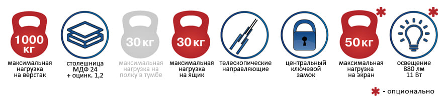 Верстак Profi WT140.WD5/WD5.000Артикул: 15838-1Артикул: 15838-2Артикул: 15838-3Артикул: 15838-4Артикул: 15838-5Выберите Экран верстака: двойной экранодинарный экранбез экранаВыберите Освещение верстака: без освещениясветодиодное освещениеОсновной склад: Нет в наличииСклад Новосибирск: Нет в наличииОсновной склад: Нет в наличииСклад Новосибирск: Нет в наличииОсновной склад: Нет в наличииСклад Новосибирск: Нет в наличииОсновной склад: Нет в наличииСклад Новосибирск: Нет в наличииОсновной склад: Нет в наличииСклад Новосибирск: Нет в наличииТовар с выбранным набором характеристик недоступен для покупки 58 110 Р 43 950,40 РЭкономия: 14 159,60 Р Верстак Profi WT140.WD5/WD5.000 теперь в вашей корзине покупок ОписаниеХарактеристикиОтзывыДокументацияДоставкаОплатаОписаниеВерстак Profi WT140.WD5/WD5.000 Верстаки серии Profi W предназначены для удобной организации рабочего места на производстве, в учебных заведениях, мастерских и гаражах. Нажмите, чтобы увеличить картинку Столешница верстака изготовлена из МДФ толщиной 24 мм, покрытой оцинкованным листом металла толщиной 1,2 мм. Тумба WD-5 состоит из пяти выдвижных ящиков (три малых и два больших), оборудованных телескопическими направляющими и центральным ключевым замком Практик. Нагрузка на ящик в тумбе 30 кг. Полезные габариты ящиков (ВхШхГ): малый - 100х380х600 мм; большой - 190х380х600 мм. Верстак окрашен порошковой краской, способной выдерживать длительную температурную и механическую нагрузку. Опция для верстака: экран с толщиной металла 1,2 мм, квадратной перфорацией 10х10 мм, шагом 38 мм. Нагрузка на экран 50 кг. Опция для экрана: светодиодное освещение с мощностью 11 Вт, световым потоком 880 лм, цветовой температурой 4000 К. Верстак поставляется в разобранном виде. Нажмите, чтобы увеличить картинку Базовая комплектация: Столешница WT-140 – 1 шт. Тумба WD-5 - 2 шт. Дополнительные опции: Комплект косынок для крепления экранов WS – 1 шт. Комплект освещения W – 1 шт. Кронштейн крепления двух экранов WS (2 шт.) – 1 шт. (если нет освещения) Экран WS-140 (без косынок) – 1 шт. (количество зависит от выбранной модели) Дополнительные аксессуары на экран для инструментов: Помогают удобно организовать рабочее место Нажмите на картинку, чтобы посмотреть все дополнительные аксессуары на экранХарактеристики Макс. нагрузка на верстак, кг1000 Макс. нагрузка на ящик30 кг Высота рабочей поверхности, мм870 Ширина столешницы, мм1400 Глубина столешницы, мм700 Тумба 1WD-5 с пятью ящиками Тумба 2WD-5 с пятью ящиками Кол-во ящиков10 Вес102 кг Гарантия1 год ПроизводительПРОМЕТ (Россия) Отзывы посетителей(0)Оставьте отзыв об этом товаре первым!ДокументацияДоставкаТранспортировка товара с Основного склада до адреса в Барнауле или ПВЗ (пункта выдачи заказов) осуществляется в течение 2-9 рабочих дней после оформления заказа и его оплаты. Варианты доставки: Доставка до адреса Самовывоз из ПВЗ (пункта выдачи заказов) Стоимость транспортировки зависит от заказа (объем, вес) — её можно уточнить у менеджера по тел.: Порядок получения заказаПри получении заказа рекомендуется распаковать товар и сверить с заказом. После получения и проверки заказа необходимо ознакомиться с документами и подписать их.После подписания акта приёма-передачи претензии по комплектации не принимаются. Доставка по всей РоссииМы можем отправить товар в любой город России транспортными компаниями. Склады расположены в 34 городах страны. Наш