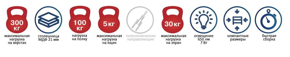 Верстак Garage Set 1Артикул: 35837Нет в наличии 17 200 Р 12 834 РЭкономия: 4 366 Р Верстак Garage Set 1 теперь в вашей корзине покупок Хит продажОписаниеХарактеристикиОтзывыДокументацияДоставкаОплатаОписаниеВерстак Garage Set 1 Предназначены для удобной организации рабочего места в гаражах, мастерских, в учебных заведениях, а за счет компактных размеров могут быть установлены на балконах, в бытовках. Нажмите, чтобы увеличить картинку Основные преимущества: Быстрая и легкая сборка. Весь комплект в одной коробке. Общая нагрузка на верстак до 300 кг. Размер упаковки В*Ш*Г, мм: 1140*560*140, вес 29 кг. Возможность установки дополнительных элементов. Столешница фанера 21 мм покрытая лаком. Нагрузка на столешницу до 100 кг. Полка MS Standart 100x50 с шагом перестановки 50 мм. Нагрузка на полку до 100 кг. Четыре стойки MS Hard – сталь 1,5 мм, сечение 40х40 мм. Два ящика Garage с нагрузкой до 5 кг на ящик. Экран с перфорацией 10х10 мм, шаг 38 мм, сталь 0,8 мм. Нагрузка на экран до 30 кг. Светодиодное освещение. Мощность 7 Вт; световой поток - 650 лм; цветовая температура – белый 4200 К с козырьком. Комплект из трех аксессуаров (Держатель ключей WH, Держатель инструмента TH, Полка малая SSh). Комплектация Столешница - 1 шт. Полка MS Standart 100x50 – 1 шт. Стойка MS Hard – 4 шт. Ящик Garage - 2 шт. Экран - 1 шт. Светодиодное освещение - 1 шт. Держатель ключей WH - 1 шт. Держатель инструмента TH - 1 шт. Полка малая SSh - 1 шт. Дополнительные аксессуары на экран для инструментов: Помогают удобно организовать рабочее место Нажмите на картинку, чтобы посмотреть все дополнительные аксессуары на экранХарактеристики Внешние размеры (ВхШхГ)1500 × 1000 × 500 мм Макс. нагрузка на верстак, кг300 Макс. нагрузка на полку, кг100 Макс. нагрузка на ящик5 кг Высота рабочей поверхности, мм920 Ширина столешницы, мм1000 Глубина столешницы, мм500 Транспортные размеры (ВхШхГ)1140 × 560 × 140 мм Вес29 кг ПроизводительПРОМЕТ (Россия) Отзывы посетителей(0)Оставьте отзыв об этом товаре первым!ДокументацияДоставкаТранспортировка товара с Основного склада до адреса в Барнауле или ПВЗ (пункта выдачи заказов) осуществляется в течение 2-9 рабочих дней после оформления заказа и его оплаты. Варианты доставки: Доставка до адреса Самовывоз из ПВЗ (пункта выдачи заказов) Стоимость транспортировки зависит от заказа (объем, вес) — её можно уточнить у менеджера по тел.: Порядок получения заказаПри получении заказа рекомендуется распаковать товар и сверить с заказом. После получения и проверки заказа необходимо ознакомиться с документами и подписать их.После подписания акта приёма-передачи претензии по комплектации не принимаются. Доставка по всей РоссииМы можем отправить товар в любой город России транспортными компаниями. Склады расположены в 34 городах страны. Наши менеджеры могут подобрать самый оптимальный вариант доставки до Вашего города. Мы работаем с любыми транспортными компаниями, с которыми Вам удобнее работать. Наши менеджеры самостоятельно рассчитывают стоимость во многих крупных транспортных компаниях и предлагают клиентам более быстрый и недорогой способ доставки. Чаще всего отправка осуществляется транспортными компаниями ПЭК, Деловые линии, СДЭК. ОплатаВ интернет-магазине "Стальхаус" доступны несколько способов оплаты заказа. Для юридических лиц: Безналичная оплата по счёту без НДС Безналичная оплата по счёту с НДС (при этом стоимость не меняется) Безналичная оплата по счёту в ба