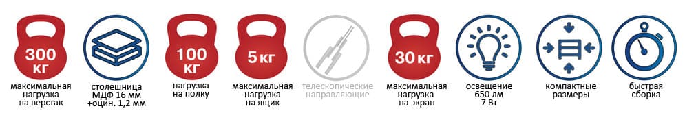 Верстак Garage Set 2Артикул: 35838Нет в наличии 17 200 Р 12 834 РЭкономия: 4 366 Р Верстак Garage Set 2 теперь в вашей корзине покупок ОписаниеХарактеристикиОтзывыДокументацияДоставкаОплатаОписаниеВерстак Garage Set 2 Предназначены для удобной организации рабочего места в гаражах, мастерских, в учебных заведениях, а за счет компактных размеров могут быть установлены на балконах, в бытовках. Нажмите, чтобы увеличить картинку Основные преимущества: Быстрая и легкая сборка. Весь комплект в одной коробке. Общая нагрузка на верстак до 300 кг. Размер упаковки В*Ш*Г, мм: 1140*560*140, вес 29 кг. Возможность установки дополнительных элементов. Столешница МДФ 16 мм покрытая листом оцинкованного металла 1.2 мм. Нагрузка на столешницу до 100 кг. Полка MS Standart 100x50 с шагом перестановки 50 мм. Нагрузка на полку до 100 кг. Четыре стойки MS Hard – сталь 1,5 мм, сечение 40х40 мм. Два ящика Garage с нагрузкой до 5 кг на ящик. Экран с перфорацией 10х10 мм, шаг 38 мм, сталь 0,8 мм. Нагрузка на экран до 30 кг. Светодиодное освещение. Мощность 7 Вт; световой поток - 650 лм; цветовая температура – белый 4200 К с козырьком. Комплект из трех аксессуаров (Держатель ключей WH, Держатель инструмента TH, Полка малая SSh). Комплектация Столешница МДФ - 1 шт. Полка MS Standart 100x50 - 1 шт. Стойка MS Hard - 4 шт. Ящик Garage - 2 шт. Экран - 1 шт. Светодиодное освещение - 1 шт. Держатель ключей WH - 1 шт. Держатель инструмента TH - 1 шт. Полка малая SSh - 1 шт. Дополнительные аксессуары на экран для инструментов: Помогают удобно организовать рабочее место Нажмите на картинку, чтобы посмотреть все дополнительные аксессуары на экранХарактеристики Внешние размеры (ВхШхГ)1500 × 1000 × 500 мм Макс. нагрузка на верстак, кг300 Макс. нагрузка на полку, кг100 Макс. нагрузка на ящик5 кг Высота рабочей поверхности, мм920 Ширина столешницы, мм1000 Глубина столешницы, мм500 Транспортные размеры (ВхШхГ)1140 × 560 × 140 мм Вес35 кг ПроизводительПРОМЕТ (Россия) Отзывы посетителей(0)Оставьте отзыв об этом товаре первым!ДокументацияДоставкаТранспортировка товара с Основного склада до адреса в Барнауле или ПВЗ (пункта выдачи заказов) осуществляется в течение 2-9 рабочих дней после оформления заказа и его оплаты. Варианты доставки: Доставка до адреса Самовывоз из ПВЗ (пункта выдачи заказов) Стоимость транспортировки зависит от заказа (объем, вес) — её можно уточнить у менеджера по тел.: Порядок получения заказаПри получении заказа рекомендуется распаковать товар и сверить с заказом. После получения и проверки заказа необходимо ознакомиться с документами и подписать их.После подписания акта приёма-передачи претензии по комплектации не принимаются. Доставка по всей РоссииМы можем отправить товар в любой город России транспортными компаниями. Склады расположены в 34 городах страны. Наши менеджеры могут подобрать самый оптимальный вариант доставки до Вашего города. Мы работаем с любыми транспортными компаниями, с которыми Вам удобнее работать. Наши менеджеры самостоятельно рассчитывают стоимость во многих крупных транспортных компаниях и предлагают клиентам более быстрый и недорогой способ доставки. Чаще всего отправка осуществляется транспортными компаниями ПЭК, Деловые линии, СДЭК. ОплатаВ интернет-магазине "Стальхаус" доступны несколько способов оплаты заказа. Для юридических лиц: Безналичная оплата по счёту без НДС Безналичная оплата по счёту с НДС (при этом стоимость не меняется) Безналичная оп