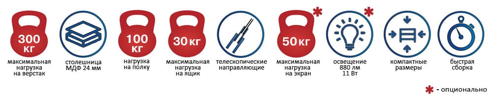 Верстак Master M100.MF1/MF1.101Артикул: 15811-1Артикул: 15811-2Артикул: 15811-3Артикул: 15811-4Артикул: 15811-5Варианты: без экрана, без освещенияодинарный экран, без освещенияодинарный экран, светодиодное освещениедвойной экран, без освещениядвойной экран, светодиодное освещениеОсновной склад: Нет в наличииСклад Новосибирск: Нет в наличииОсновной склад: Нет в наличииСклад Новосибирск: Нет в наличииОсновной склад: Нет в наличииСклад Новосибирск: Нет в наличииОсновной склад: Нет в наличииСклад Новосибирск: Нет в наличииОсновной склад: Нет в наличииСклад Новосибирск: Нет в наличии 18 160 Р 13 738,40 РЭкономия: 4 421,60 Р Верстак Master M100.MF1/MF1.101 теперь в вашей корзине покупок ОписаниеХарактеристикиОтзывыДокументацияДоставкаОплатаОписаниеВерстак Master M100.MF1/MF1.101 Металлические верстаки серии MASTER предназначены для удобной организации рабочего места в гаражах, мастерских, в учебных заведениях, и даже на балконах, за счет компактных размеров. Нажмите, чтобы увеличить картинку Основные преимущества: Основные элементы верстака (опоры, полка, подпятники, накладка на столешницу) изготовлены из оцинкованной стали, что позволяет устанавливать его в местах с повышенной влажностью. В стандартной комплектации используется столешница M-100 из многослойной фанеры толщиной 24 мм, обработанной бесцветным лаком. Верстак может оснащаться столешницей MT-100 из многослойной фанеры толщиной 24 мм, покрытой оцинкованным листом металла толщиной 1,2 мм. Распределенная нагрузка на столешницу - 300 кг. Опоры изготовлены из оцинкованного металлического профиля 55х30 мм, шаг перфорации 50 мм. Полка с нагрузкой 100 кг и выдвижной ящик с нагрузкой 30 кг. Телескопические направляющие выдвижных ящиков, обеспечивают свободный и плавный ход даже при полной загрузке. Компактные габариты 1000х500 мм позволяют разместить верстак в местах с ограниченной площадью. Возможность хранения под столешницей верстака до 4-х колес R15 195/65 R16 205/55. За счет единой опоры верстаки можно устанавливать в линии и секции. Поставляются в разобранном виде. Верстак можно приобрести как в комплекте (в единой таре), так и собрать из комплектующих. Базовая комплектация Опора МF-1 - 2 шт. Балка M 90 - 3 шт. Столешница М-100 - 1 шт. Ящик верстачный М-140 - 1 шт. Полка верстачная М-100 - 1 шт. *Цена указана без подпятников стойки MS Pro Дополнительные аксессуары на экран для инструментов: Помогают удобно организовать рабочее место Нажмите на картинку, чтобы посмотреть все дополнительные аксессуары на экранХарактеристики Внешние размеры (ВхШхГ)875 × 1000 × 500 мм Макс. нагрузка на верстак, кг300 Макс. нагрузка на полку, кг100 Макс. нагрузка на ящик30 кг Высота рабочей поверхности, мм875 Ширина столешницы, мм1000 Глубина столешницы, мм500 Кол-во ящиков1 Кол-во полок1 Транспортные размеры (ВхШхГ)1020 × 535 × 120 мм Вес42 кг Гарантия1 год ПроизводительПРОМЕТ (Россия) Отзывы посетителей(0)Оставьте отзыв об этом товаре первым!ДокументацияДоставкаТранспортировка товара с Основного склада до адреса в Барнауле или ПВЗ (пункта выдачи заказов) осуществляется в течение 2-9 рабочих дней после оформления заказа и его оплаты. Варианты доставки: Доставка до адреса Самовывоз из ПВЗ (пункта выдачи заказов) Стоимость транспортировки зависит от заказа (объем, вес) — её можно уточнить у менеджера по тел.: Порядок получения заказаПри получении заказа рекомендуется распаковать товар и сверить с заказом. Посл